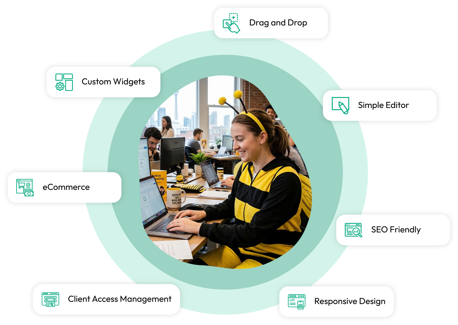 Stop juggling tools and wasting weeks on manual website builds. SMBee’s Smart Site Builder combines an intuitive drag-and-drop editing and built-in website optimization tools so your team can launch faster and deliver better results.